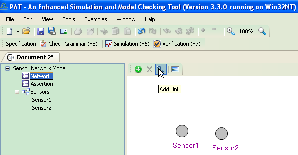 Similar, clicking the arrow button and then clicking two sensors sequentially will create a logical link between two sensors. In PAT, a network topology is considered as a directed graph.