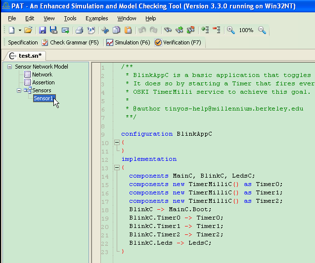 The top-level configuration of the NesC program assigned to a certain sensor can be viewed in PAT editor, by double clicking the sensor from the Sensors list on the left panel.