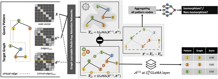 Subgraph matching is a challenging problem with a wide range of applications in drug discovery, social network analysis, biochemistry, and cognitive science. It involves determining whether a given query graph is present within a larger target graph. Traditional graph-matching algorithms provide precise results but face challenges in large graph instances due to the NP-complete nature of the problem, limiting their practical applicability. In contrast, recent neural network-based approximations offer more scalable solutions but often lack interpretable node correspondences. To address these limitations, this article presents a multi-task learning framework called xNeuSM: Explainable Neural Subgraph Matching, which introduces Graph Learnable Multi-hop Attention Networks (GLeMA) that adaptively learn the parameters governing the attention factor decay for each node across hops rather than relying on fixed hyperparameters. Our framework jointly optimizes both subgraph matching and finding subgraph-isomorphism mappings. We provide a theoretical analysis establishing error bounds for GLeMA’s approximation of multi-hop attention as a function of the number of hops. Additionally, we prove that learning distinct attention decay factors for each node leads to a correct approximation of multi-hop attention. Empirical evaluation on real-world datasets shows that xNeuSM achieves substantial improvements in prediction F1 score of up to 34% compared to approximate baselines and, notably, at least a seven-fold faster query time than exact algorithms. With these results, xNeuSM can be applied to solve matching problems in various domains spanning from biochemistry to social science