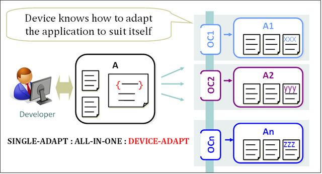 ii) DEVICE-ADAPT: The software is written in an abstract way, and the device decides how to adapt it to the prevailing OC, at run-time. This approach is commonly applied when dealing with fragmentation in the UI part of an application.