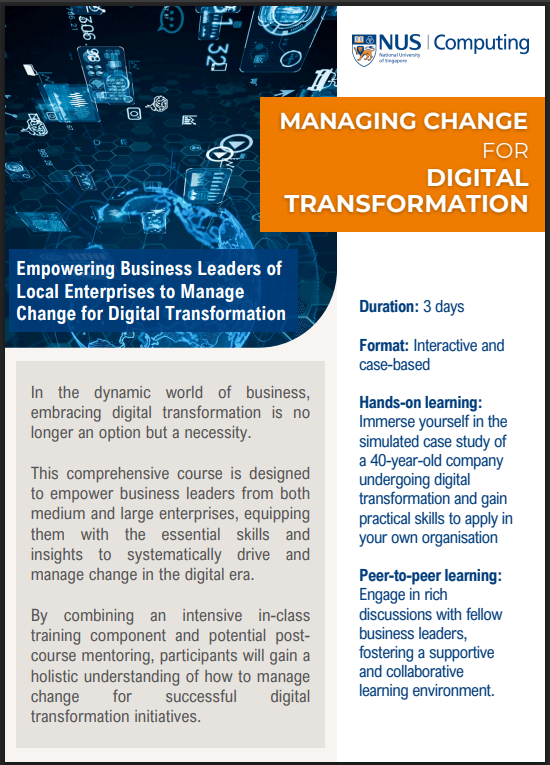A three-day hands-on workshop to prepare technology and business leaders to plan, drive and navigate change for digital transformations. This course provides technology and business leaders with a robust framework to systematically identify areas requiring change management when navigating digital transformations. It is designed for leaders who are responsible for driving a consistent and concerted approach to change across the organisation. Through interactive experiential learning and peer-to-peer sharing, you will be guided to develop insights on how you are managing your organisation’s transformation journey. By applying the framework to your insights, you will be able to develop a tailored and robust change plan to address today’s issues and also prepare your organisation for change on the horizon.