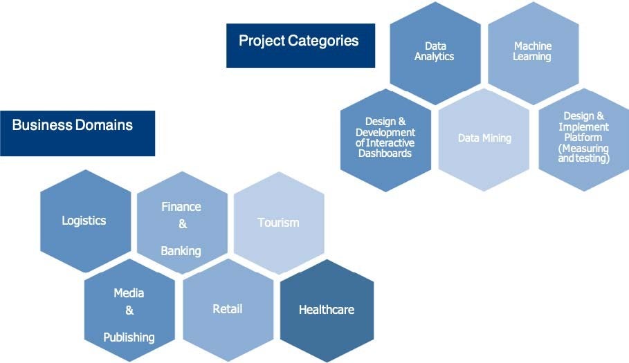 We are unable to share specific examples and companies, as all our projects are bound by NDAs. However, we have done many projects involving various domains, including finance, healthcare, transportation, technology, entertainment, marketing, education, etc. The completed projects have involved developing dashboard applications (e.g., for customer-facing agents/staff, senior management, or analysts), trend analyses from mining and analyzing data (both company data and publicly available data), developing prediction models on demand and sales, and developing and implementing optimization models for resource allocations.