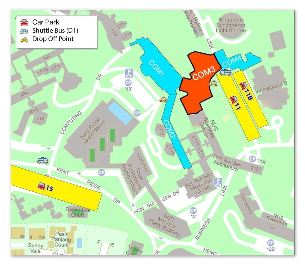 - Car Park 15 (Opposite NUSS Guild House) – Internal Shuttle Bus D1 opposite the entrance to Car Park 15 will bring visitors directly to COM3.