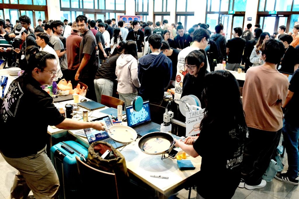 Among the many inventive projects was QuackForSizzle, a cooking game that replaced traditional controllers with microcontroller-rigged frying pans equipped with gyroscopes and NFC sensors – a crowd favourite that embodied the playful ingenuity on display.
