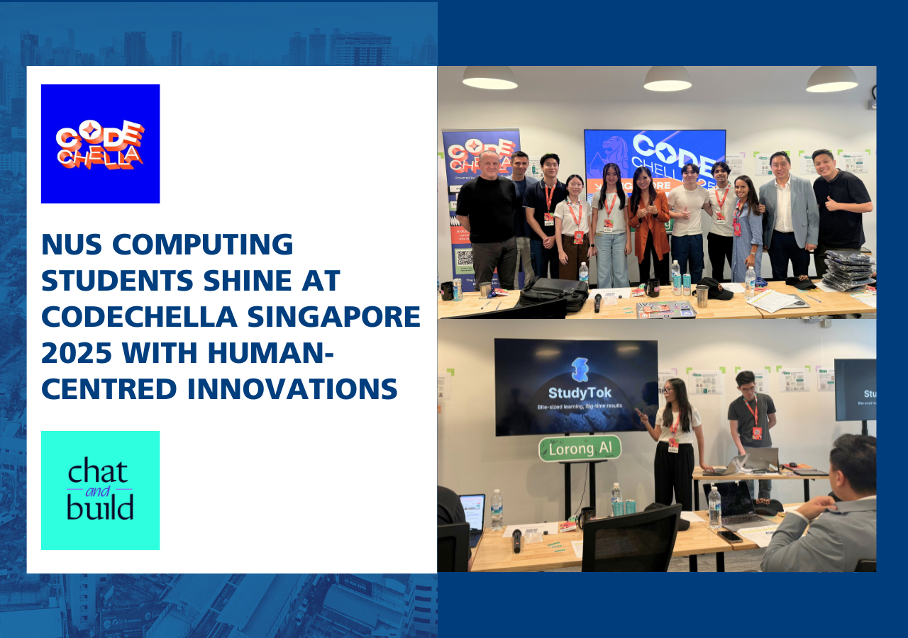 NUS Computing students made a strong showing at this year’s Codechella Tour: Singapore – a nationwide innovation festival hosted by ChatAndBuild that brought together more than 200 students from 10 universities to build AI-driven solutions for real-world needs.