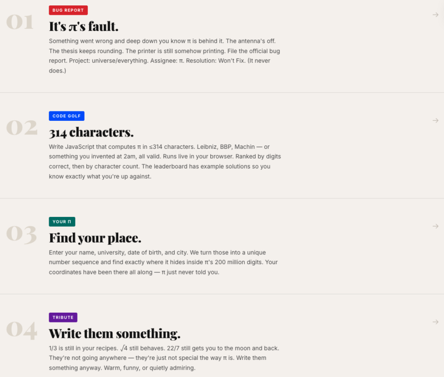 Instead of static graphics or lists of digits, pidayfest.com invites visitors to explore π in playful and interactive ways. Users can search for number sequences – including names converted into digits – within the infinite digits of π, experiment with small mathematical tools, and take part in coding challenges inspired by the famous constant.