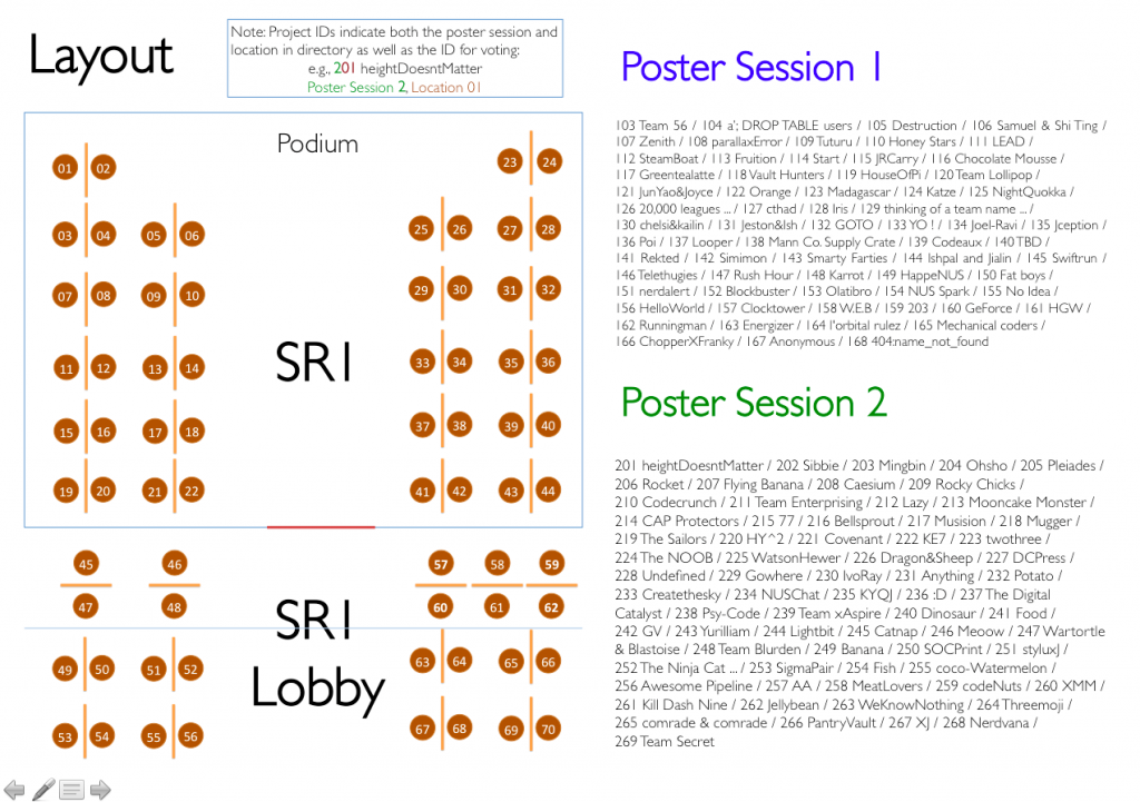 A: The voter IDs are what you use for voting for best projects. The project ID is the number that uniquely identifies your project number (see the above for in the SR1 Layout; all projects in Poster Session 1 will start with ‘1’ and likewise for Poster Session 2), and they are different than the project IDs that were assigned during Ignition and Liftoff (sorry for the confusion). They will be posted on the poster board itself so that everyone can identify projects uniformly, in the same manner.