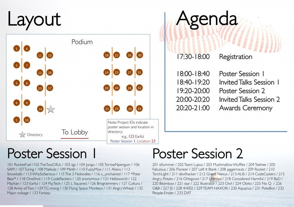 However, if you wish to still repeat the project ID on your poster you’re welcomed to. The Splashdown page will soon list the project ID. Basically it corresponds to the position of the poster board where you’ll be presenting, prefixed by a ‘1’ or ‘2’ for which poster session you’ll be in (see earlier question and answer in FAQ).