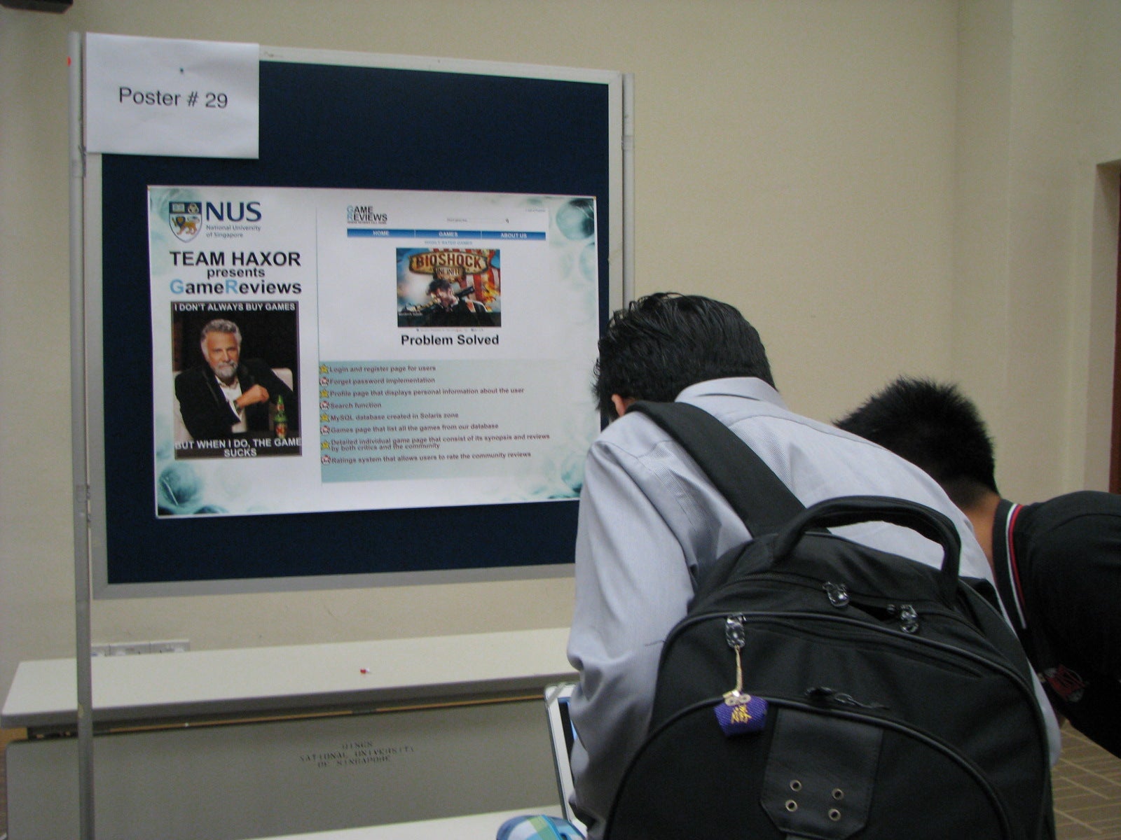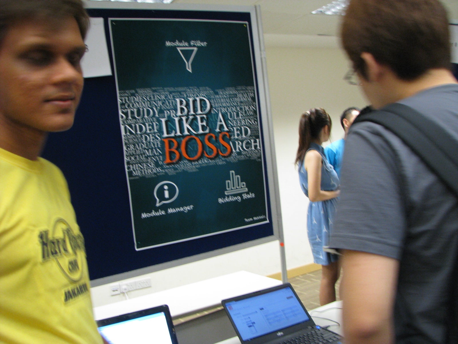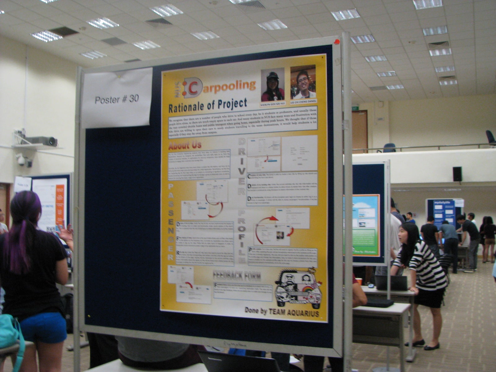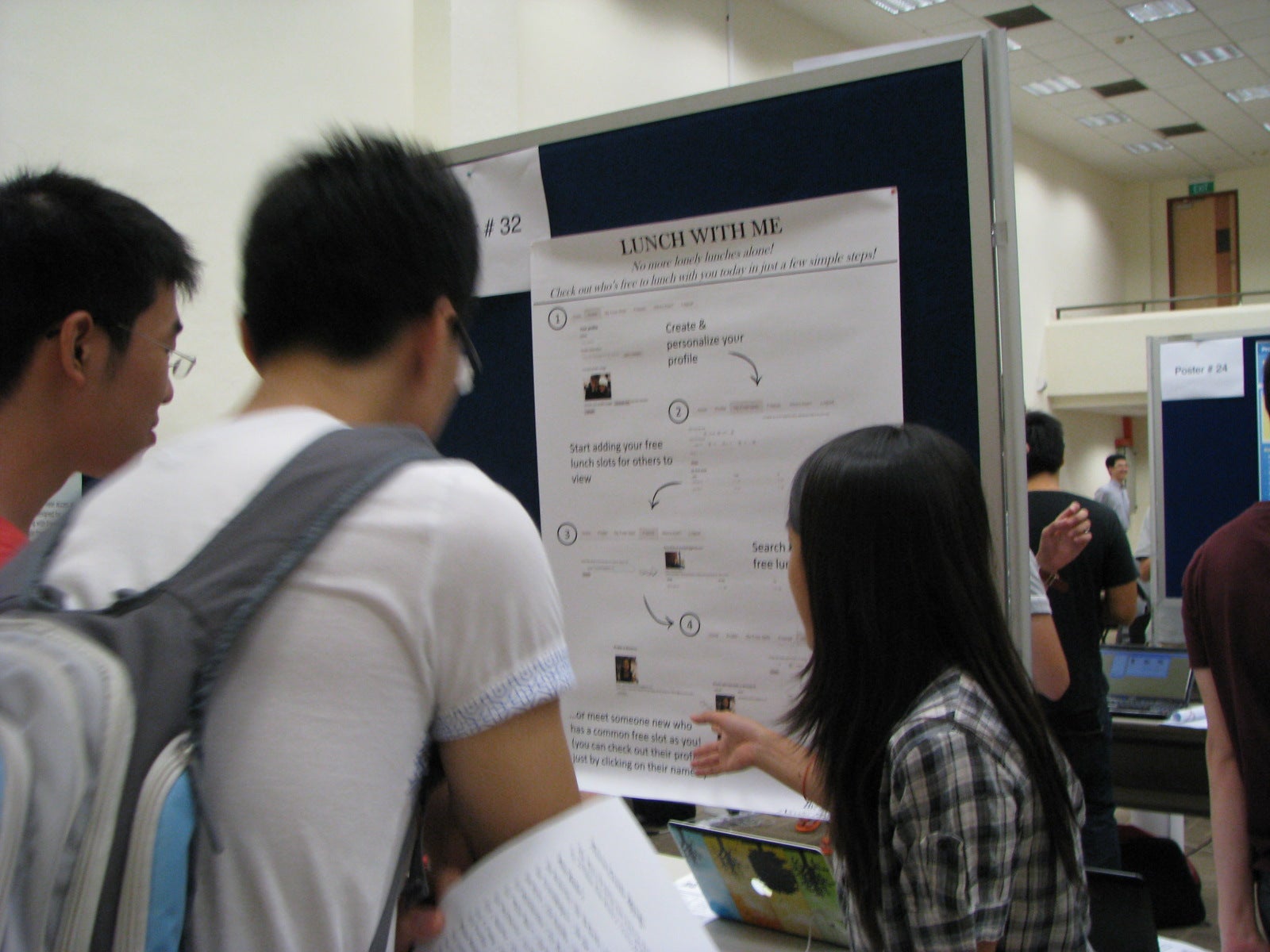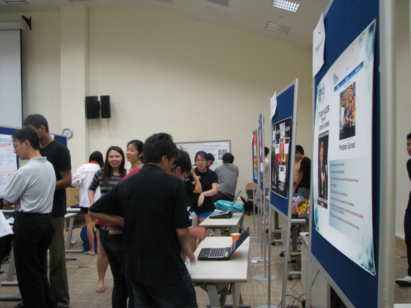 Remember that Google SG is giving away prizes to best project, where you (and us) have voting privileges to help determine the winners, so whatever you want to do to curry favor with your peers is a-ok (within NUS policy, of course). You’ll find that marketing is a very big key for technology acceptance in the real world, anyways. You can check out similar poster sessions at the STePS events, done by your seniors: