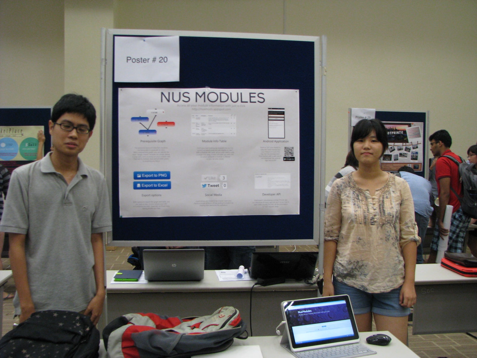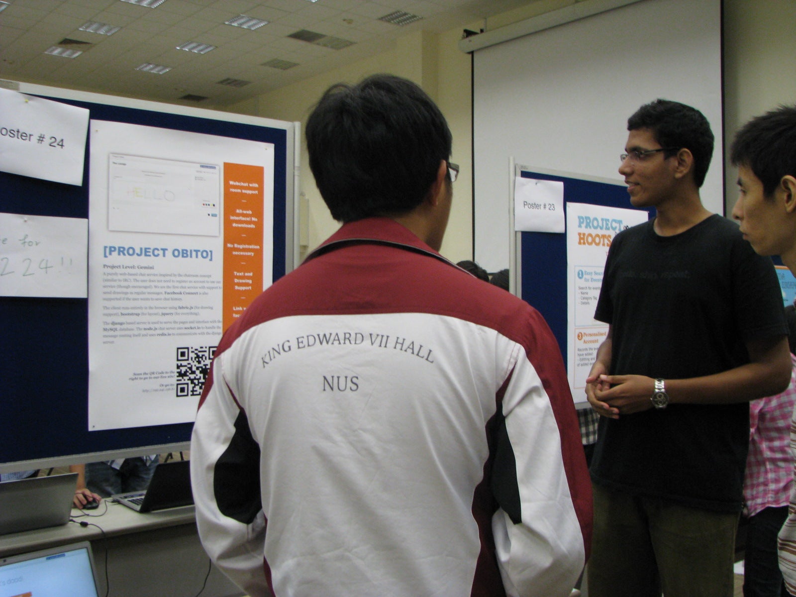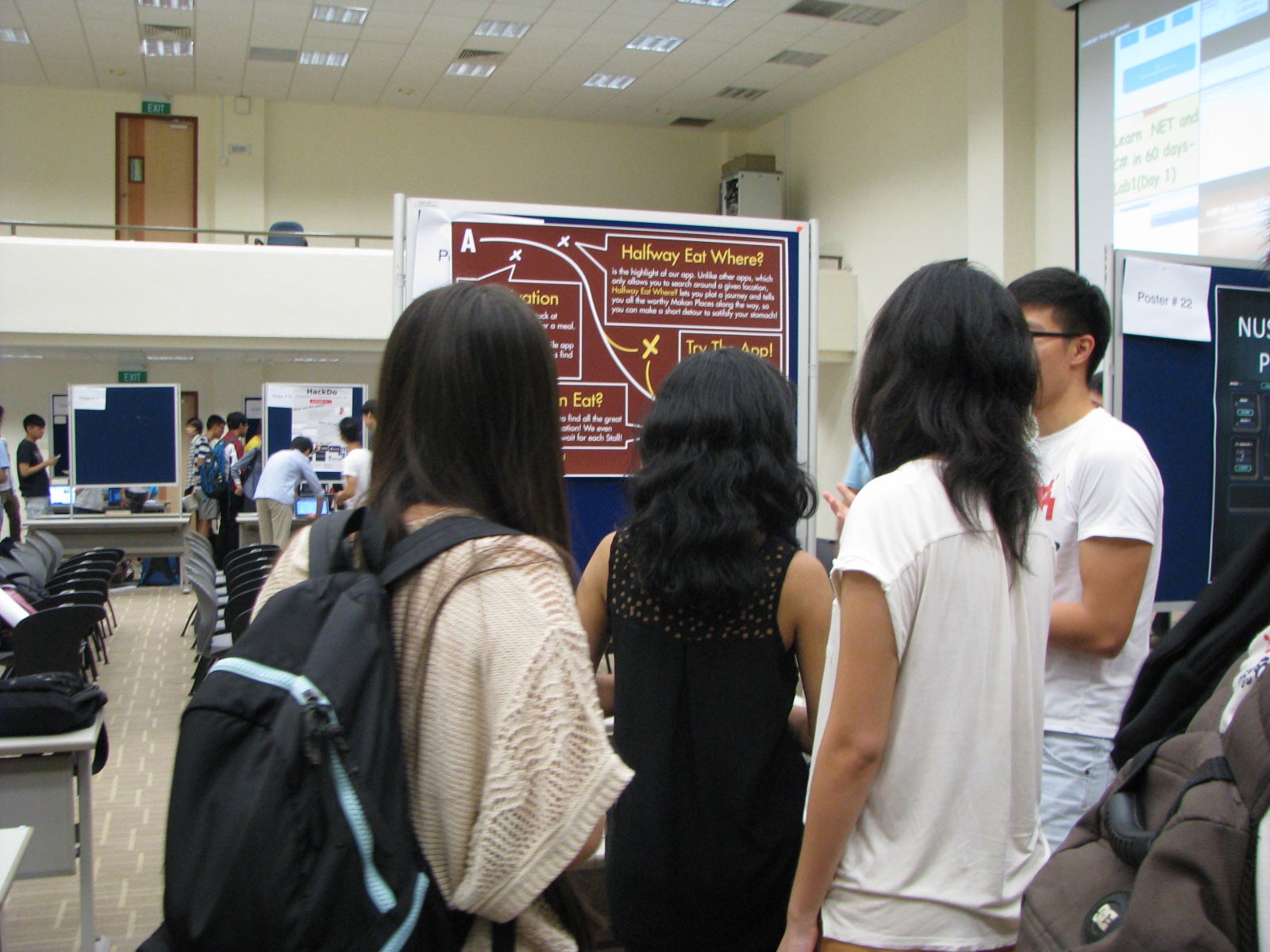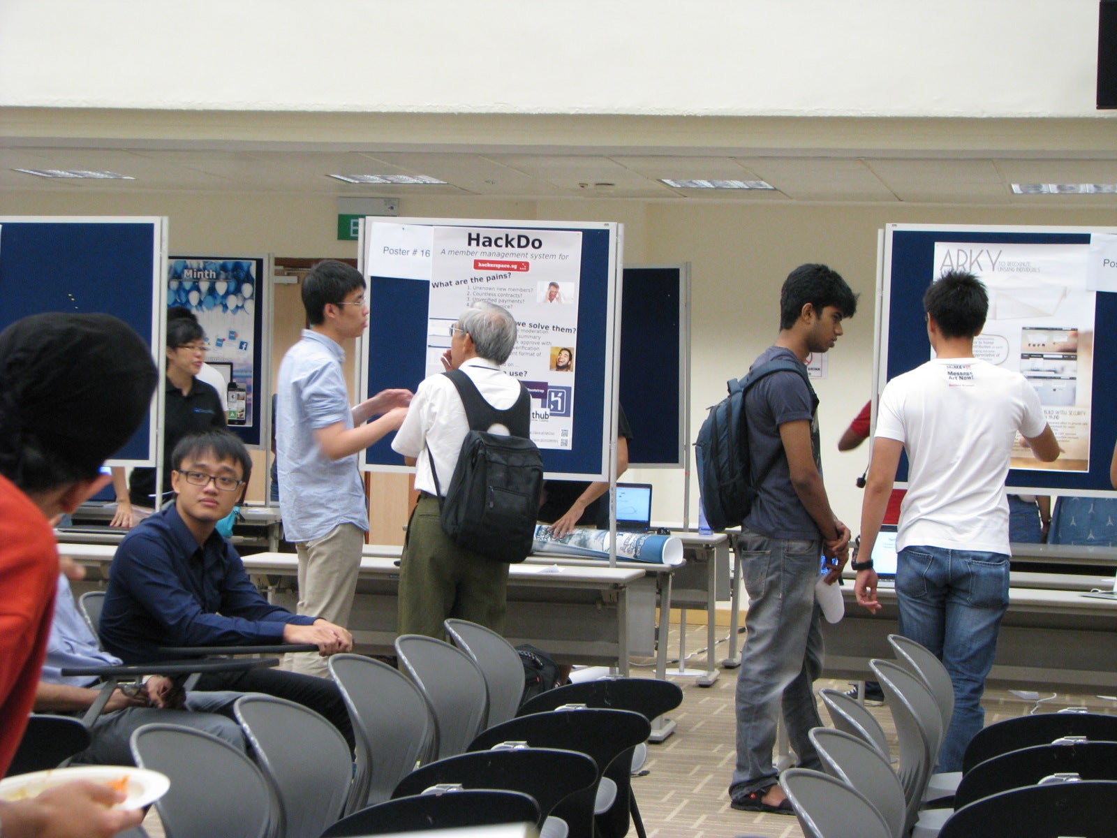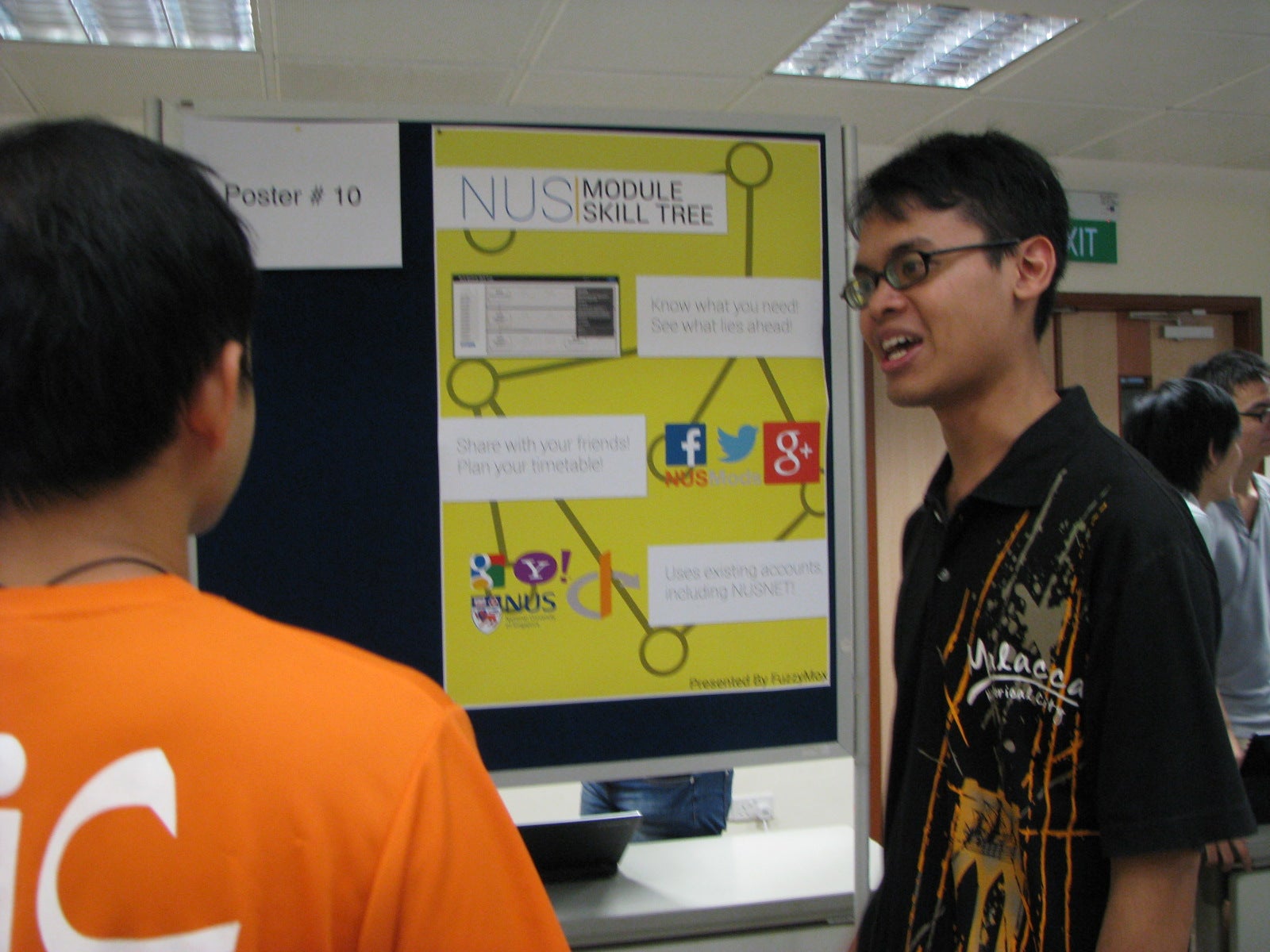Remember that Google SG is giving away prizes to best project, where you (and us) have voting privileges to help determine the winners, so whatever you want to do to curry favor with your peers is a-ok (within NUS policy, of course). You’ll find that marketing is a very big key for technology acceptance in the real world, anyways. You can check out similar poster sessions at the STePS events, done by your seniors:
