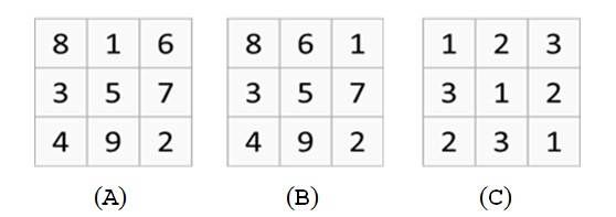 Lastly, matrix C is not a semi-magic square either because it includes integers 1 to 3 but not 4 to 9.