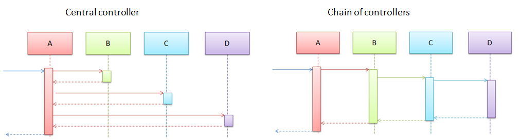 A classic example where this principle applies is when choosing between a central controller model and chain of controllers model. The former lets you keep strangers as strangers, while the latter forces strangers to talk to each other. Notice how one design below lets B and C remain strangers while the other forces them to know each other.