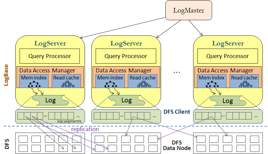 To avoid the aforementioned problems, LogBase adopts log-only storage for removing the write bottleneck and supporting fast system recovery. The overall architecture of LogBase is depicted in the above figure. LogBase is designed to be dynamically deployed in cluster environment to take advantages of the elastic scaling property as other NoSQL systems. We design a multi-version index strategy for supporting efficient access to the data maintained in the log. We also enhance LogBase to support transactions that bundle multiple read and write operations across multiple data records and provide snapshot isolation. Since LogBase is optimized for write, the main cost will be read and scan. Therefore, novel indexing structures and processing strategies are designed to ensure query performance.