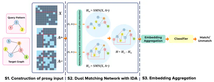 The goal of subgraph matching is to determine the presence of a particular query pattern within a large collection of data graphs. Despite being a hard problem, subgraph matching is essential in various disciplines, including bioinformatics, text matching, and graph retrieval. Although traditional approaches could provide exact solutions, their computations are known to be NP-complete, leading to an overwhelmingly querying latency. While recent neural-based approaches have been shown to improve the response time, the oversimplified assumption of the first-order network may neglect the generalisability of fully capturing patterns in varying sizes, causing the performance to drop significantly in datasets in various domains. To overcome these limitations, this paper proposes xDualSM, a dual matching neural network model with interleaved diffusion attention. Specifically, we first embed the structural information of graphs into different adjacency matrices, which explicitly capture the intra-graph and cross-graph structures between the query pattern and the target graph. Then, we introduce a dual matching network with interleaved diffusion attention to carefully capture intra-graph and cross-graph information while reducing computational complexity. Empirically, our proposed framework not only boosted the speed of subgraph matching more than 10× compared to the fastest baseline but also achieved significant improvements of 47.64% in Recall and 34.39% in F1-score compared to the state-of-the-art approximation approach on COX2 dataset. In addition, our results are comparable with exact methods.