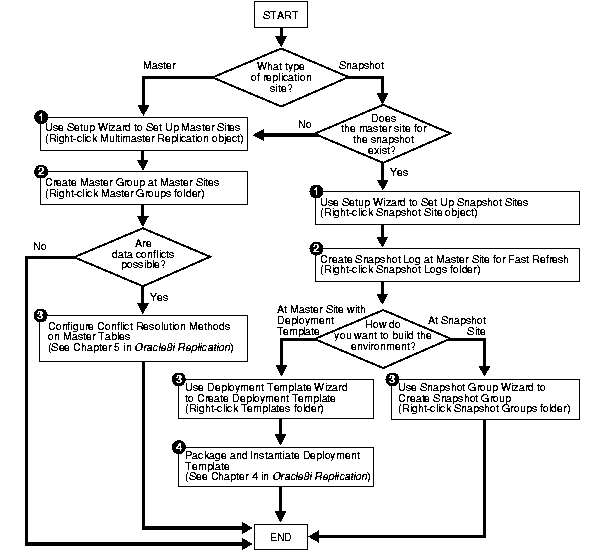 The flowchart in Figure 9-12 displays the major decisions and tasks that are involved when you create a replication environment using the Replication Management tool. The flowchart shows the major decisions and steps for building both multimaster and snapshot environments. Each task in the flowchart includes a cross reference to a section in this chapter or in the release 8.1.6 Oracle8i Replication book that provides more information about the task. Detailed instructions about completing these tasks are in the Replication Management tool online help.