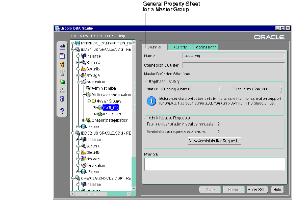 The Master Groups folder under the Multimaster Replication Object contains the master groups at the selected site. When you select a master group, you can: