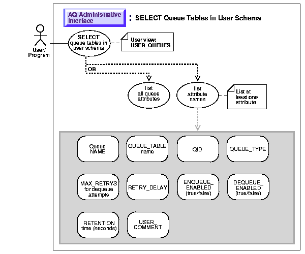 This view is the same as DBA_QUEUES with the exception that it only shows queues in the user's schema.