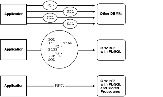However, with PL/SQL, an entire block of statements can be sent to Oracle at one time. This can drastically reduce communication between your application and Oracle. As Figure 1-5 shows, if your application is database intensive, you can use PL/SQL blocks and subprograms to group SQL statements before sending them to Oracle for execution.