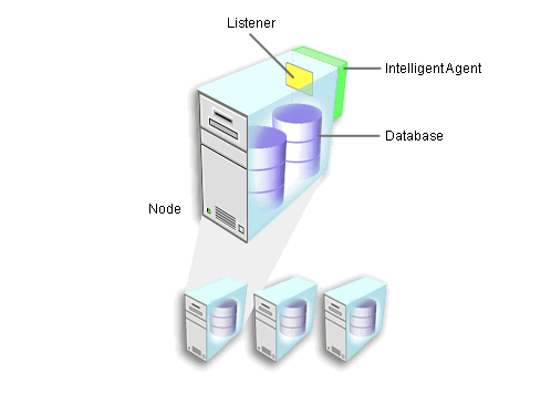 An Oracle Intelligent Agent is a process on a managed server, which monitors registered events and runs scheduled jobs against all discovered services on that server. Only one Intelligent Agent is required per node regardless of the number of services present on that machine. Intelligent Agents function independently of the database or services they support, as well as being independent of the Management Server and Console clients.