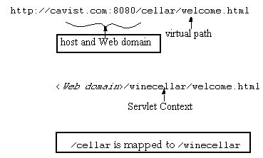 If the config object contains the entry /cellar as mapped to /winecellar, then the URL http://cavist.com:8080/cellar/welcome.html would access the servlet context, winecellar, in the Web domain, cavist.com.