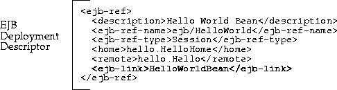As shown in Figure A-1, the <ejb-link> is mapped to <ejb-name> within the <ejb-mapping> element in the Oracle-specific deployment descriptor by providing the same logical name in both elements. The Oracle-specific deployment descriptor would have the following definition to map the logical bean name of "java:comp/env/ejb/HelloWorld" to the JNDI URL "/test/myHello".