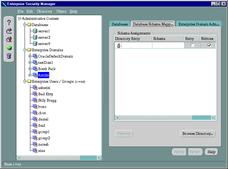 Oracle Enterprise Security Manager is an administration tool that provides a graphical user interface to manage enterprise users, enterprise domains, databases, and enterprise roles that are held in a directory server.