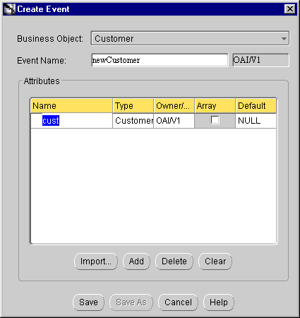 First, an event called "NewCustomerEvent" is created. When you create this object for the first time, the assigned owner is Oracle and the version is V1. This even is NewCustomerEvent/Oracle/V1.