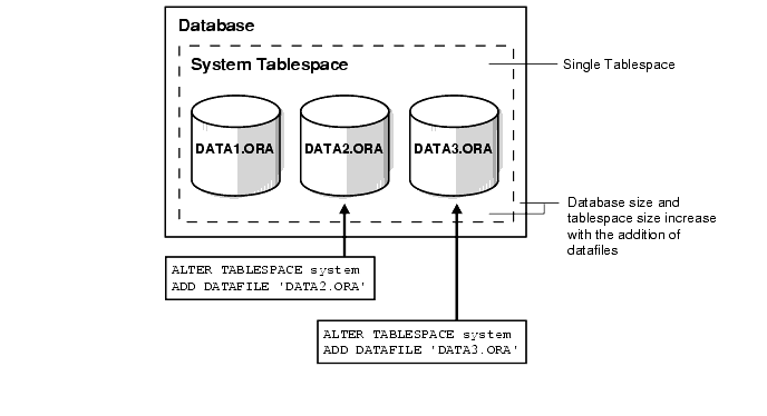 When you add another datafile to an existing tablespace, you increase the amount of disk space allocated for the corresponding tablespace. Figure 3-2 illustrates this kind of space increase.