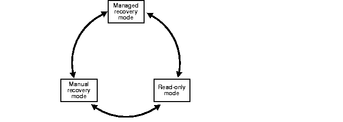 Although you cannot run the standby database in more than one mode at the same time, you can switch back and forth between the modes at will. For example, you can run in managed recovery mode, then open read-only, then switch to manual recovery, then return to managed recovery, as shown in Figure 1-1.