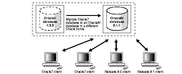 You can upgrade your release 8.0 database, for example release 8.0.6, to release 8.1 and have both version 7 and release 8.0 clients connecting to the release 8.1 database. You cannot upgrade your release 8.0 database to a release 8.1 database in the same Oracle home.