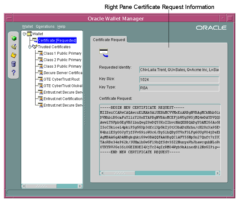 Figure 2-3 Certificate Request Information Displayed in Oracle Wallet Manager Right Pane