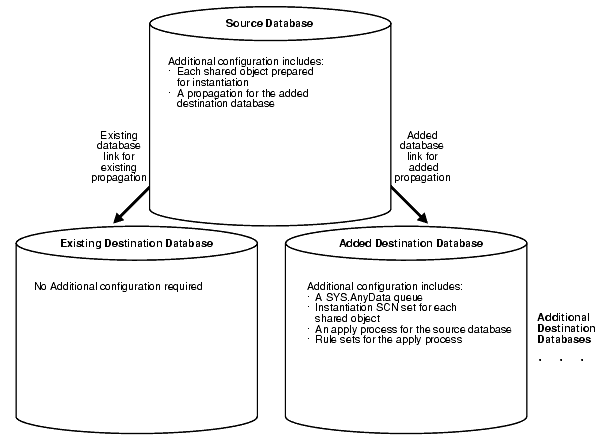 You add a destination database to an existing single-source environment by creating one or more new apply processes at the new destination database and, if necessary, configuring one or more propagations to propagate changes to the new destination database. You might also need to add rules to existing propagations in the stream that propagates to the new destination database.