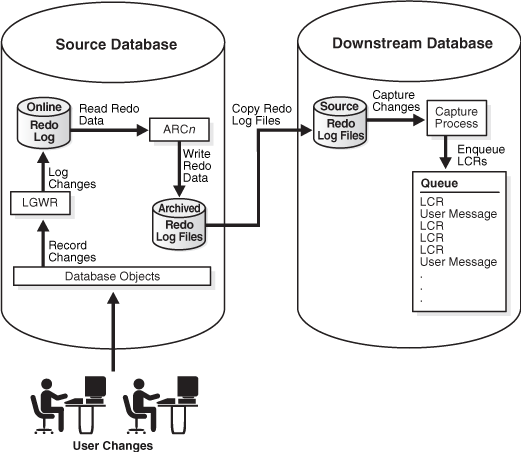A real-time downstream capture configuration means that redo transport services use the log writer process (LGWR) at the source database to send redo data from the online redo log to the downstream database. At the downstream database, a remote file server process (RFS) receives the redo data and stores it in the standby redo log, and the archiver at the downstream database archives the redo data in the standby redo log. The real-time downstream capture process captures changes from the standby redo log whenever possible and from the archived redo log whenever necessary.
