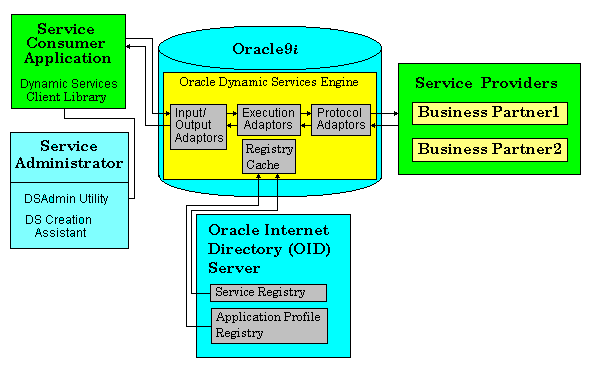 The service registry and application profile registry are deployed as directories in the Oracle Internet Directory (OID) server. The access control list of OID is used for access control, allowing service administrators to choose the services visible to a particular service consumer application. Managing services and service consumer applications in OID allows multiple instances of Dynamic Services engines to work in a synchronized fashion, giving an open, scalable option to service consumer applications. For performance reasons, the registry data is cached in an Oracle9i instance accessed by the Oracle Dynamic Services engine at service execution time. This cache can be synchronized automatically at the start of the Dynamic Services engine, or service administrators can synchronize it through their console, as required.