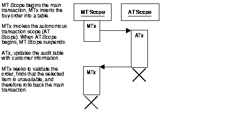 Figure 7-4 shows how control flows from the main routine (MT) to an autonomous routine (AT) and back again. As you can see, the autonomous routine can commit more than one transaction (AT1 and AT2) before control returns to the main routine.