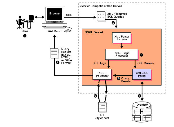XSQL Servlet is a tool that processes SQL queries and outputs the result set as XML. This processor is implemented as a Java servlet and takes as its input an XML file containing embedded SQL queries. It uses XML Parser for Java, XML- SQL Utility, and Oracle XSL Transformation (XSLT) Engine to perform many of its operations.