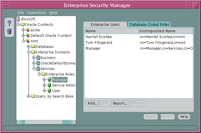 An enterprise role grantee is a directory user granted an enterprise role, including all database global roles contained within that enterprise role. You can use the Enterprise Users tabbed window (Figure 19-22) to manage enterprise role grantees, when an enterprise role is selected under an enterprise domain in the main application tree.