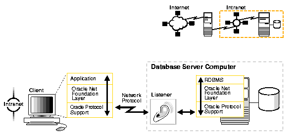 Figure 1-1 shows a typical architecture in which Internet clients connect to a company's databases through an application Web server. The figure also shows the intranet architecture that enables a company's own clients to communicate with the databases. This basic architecture will be examined further to show how Oracle networking technologies are used throughout typical network environments.