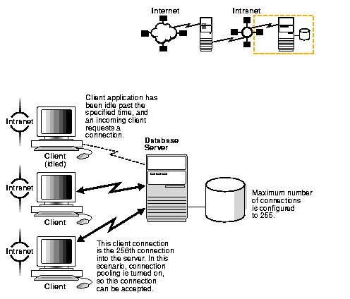 When thousands of clients are running interactive Web applications, many of these sessions may be idle at a given time. The connection pooling feature enables the database server to timeout an idle session and use the connection to service an active session. The idle logical session remains open, and the physical connection is automatically reestablished when the next request comes from that session. Therefore, Web applications can allow larger numbers of concurrent users to be accommodated with existing hardware.