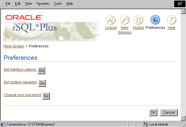 PreferencesOpens the iSQL*Plus Preferences screen where you can set interface options, system variables or change your password.