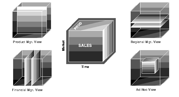 To visualize data that has many dimensions, analysts commonly use the analogy of a data cube, that is, a space where facts are stored at the intersection of n dimensions. Figure 18-1 shows a data cube and how it can be used differently by various groups. The cube stores sales data organized by the dimensions of product, market, sales, and time. Note that this is only a metaphor: the actual data is physically stored in normal tables. The cube data consists of both detail and aggregated data.
