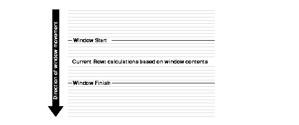For each row in a partition, you can define a sliding window of data. This window determines the range of rows used to perform the calculations for the current row. Window sizes can be based on either a physical number of rows or a logical interval such as time. The window has a starting row and an ending row. Depending on its definition, the window may move at one or both ends. For instance, a window defined for a cumulative sum function would have its starting row fixed at the first row of its partition, and its ending row would slide from the starting point all the way to the last row of the partition. In contrast, a window defined for a moving average would have both its starting and end points slide so that they maintain a constant physical or logical range.