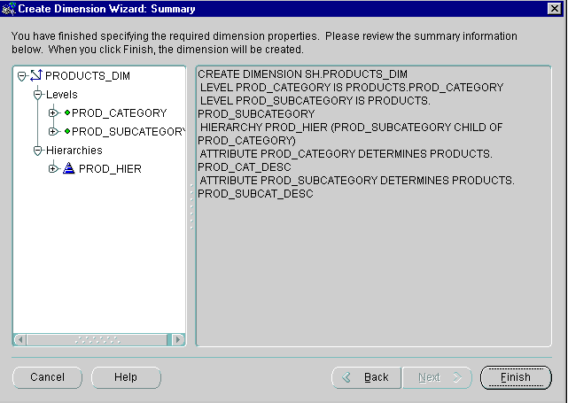 CREATE DIMENSION products_dim LEVEL product IS (products.prod_id) LEVEL subcategory IS (products.prod_subcategory) LEVEL category IS (products.prod_category) HIERARCHY prod_rollup ( product CHILD OF subcategory CHILD OF category ) ATTRIBUTE product DETERMINES (products.prod_name, products.prod_desc, prod_weight_class, prod_unit_of_measure, prod_pack_size,prod_status, prod_list_price, prod_min_price) ATTRIBUTE subcategory DETERMINES (prod_subcategory, prod_subcat_desc) ATTRIBUTE category DETERMINES (prod_category, prod_cat_desc);
