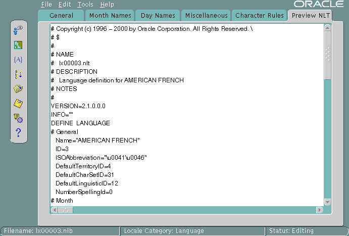 The NLT file is a text file with the file extension .nlt that shows the settings for a specific language, territory, character set, or linguistic sort. The Preview NLT screen presents a readable form of the file so that you can see whether the changes you have made look correct. You cannot modify the NLT file from the Preview NLT screen. You must use the specific elements of the Oracle Locale Builder to modify the NLT file.