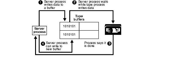 2. The tape process writes data to tape. The server process must remain idle while the media manager copies data from the Oracle buffers to the media manager's internal buffers.