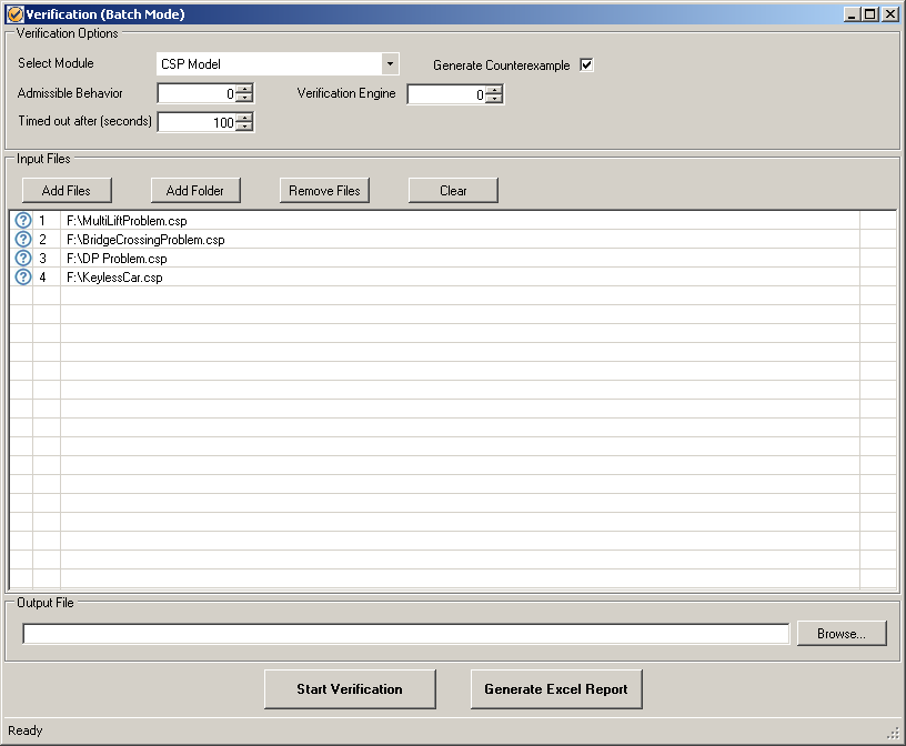 Batch Mode: Use this mode, you can get all the properties of a batch of model files verified with certain choices of options in one time. The whole verification result will be written into an output file you defined. These results can also be converted to excel files by clicking the button "Generate Excel Report".