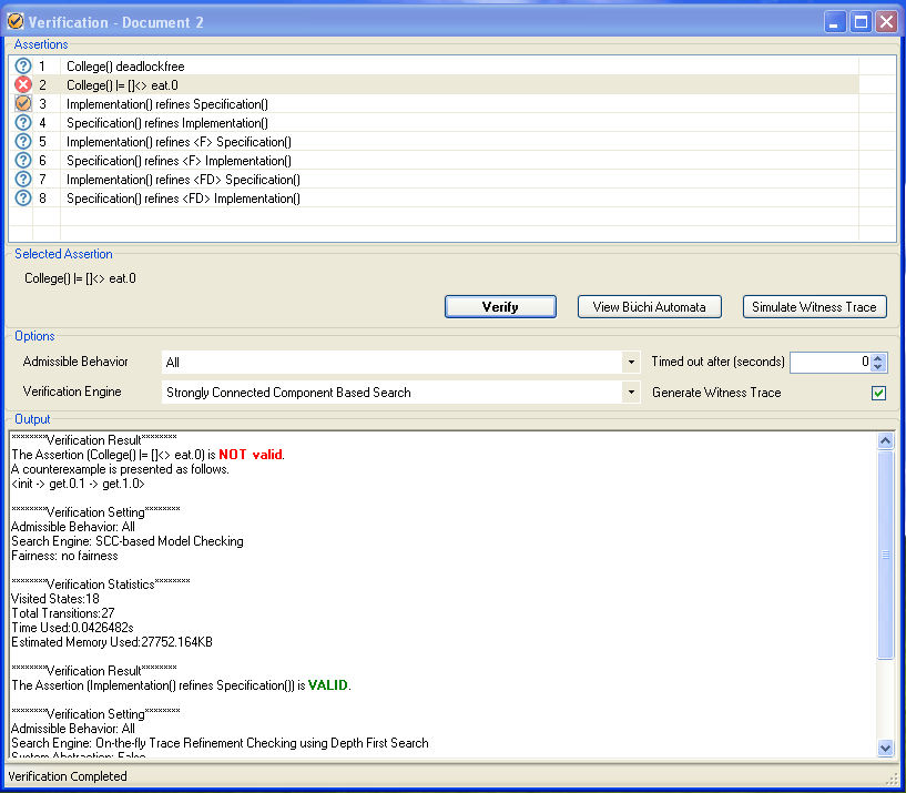 PAT Verifier allows users to check the assertions listed in the model. The verification result will be shown in different hightling colors such as red for the assertion which is not valid and green for the assertion which is valid. We provide two modes for verification, e.g. The click mode and the batch mode. Both of the two modes support the following options: