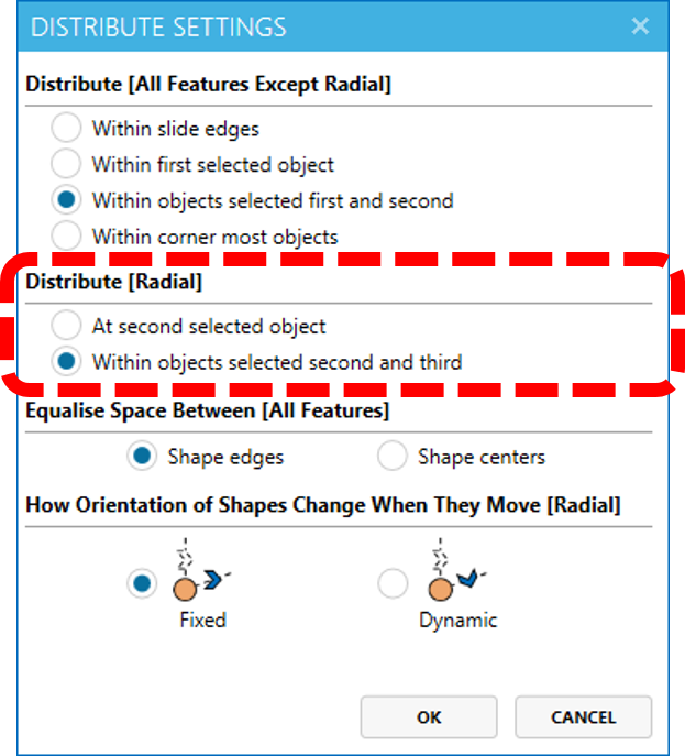 Distribute Radial moves shapes around the center of the reference object. You can choose whether the orientation of shapes changes when moving them. By default, Distribute Radial uses the option Fixed, which retains the orientation of shapes moved. Alternatively, you may select the option Dynamic to rotate shapes when they move.