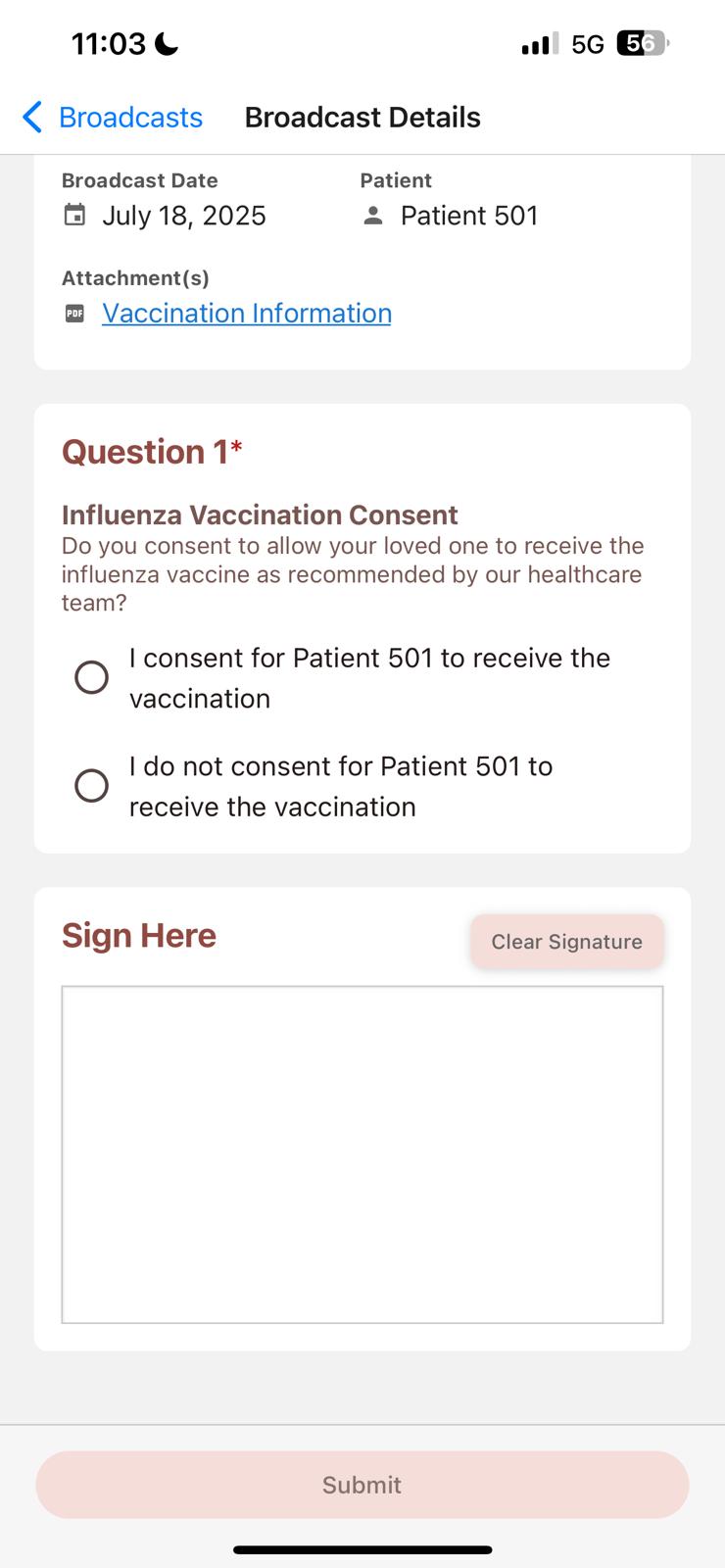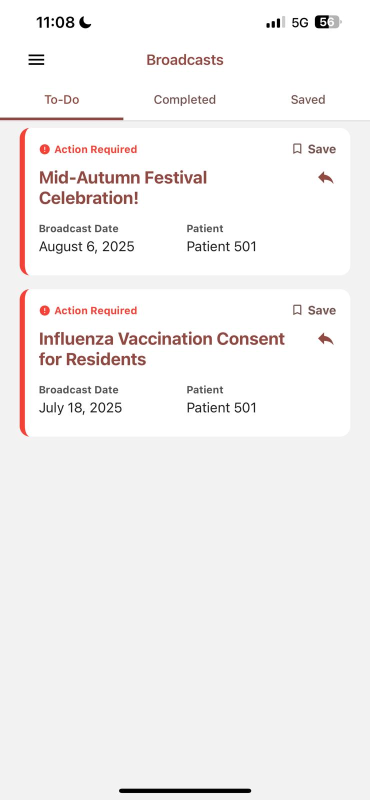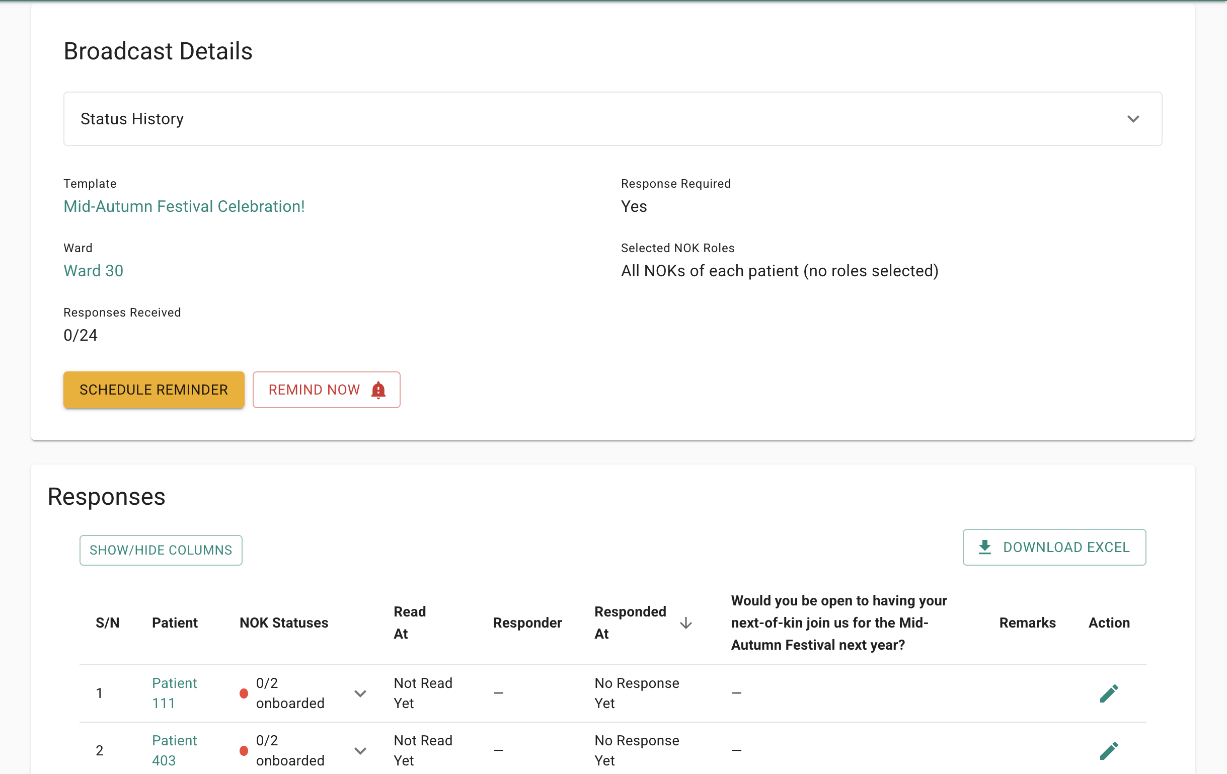 The broadcasting module is the main module of the application, and enables nurses to send consent requests to all NOK in a specific ward with a single click, eliminating the need for manual phone calls. All responses to a particular broadcast are consolidated in a single page, allowing staff to track which NOK have replied. The module also supports both scheduled and manual reminders, which are sent as push notifications to non-respondents. On the NOK mobile app, users can easily view outstanding broadcasts and respond directly through a simple and intuitive interface.