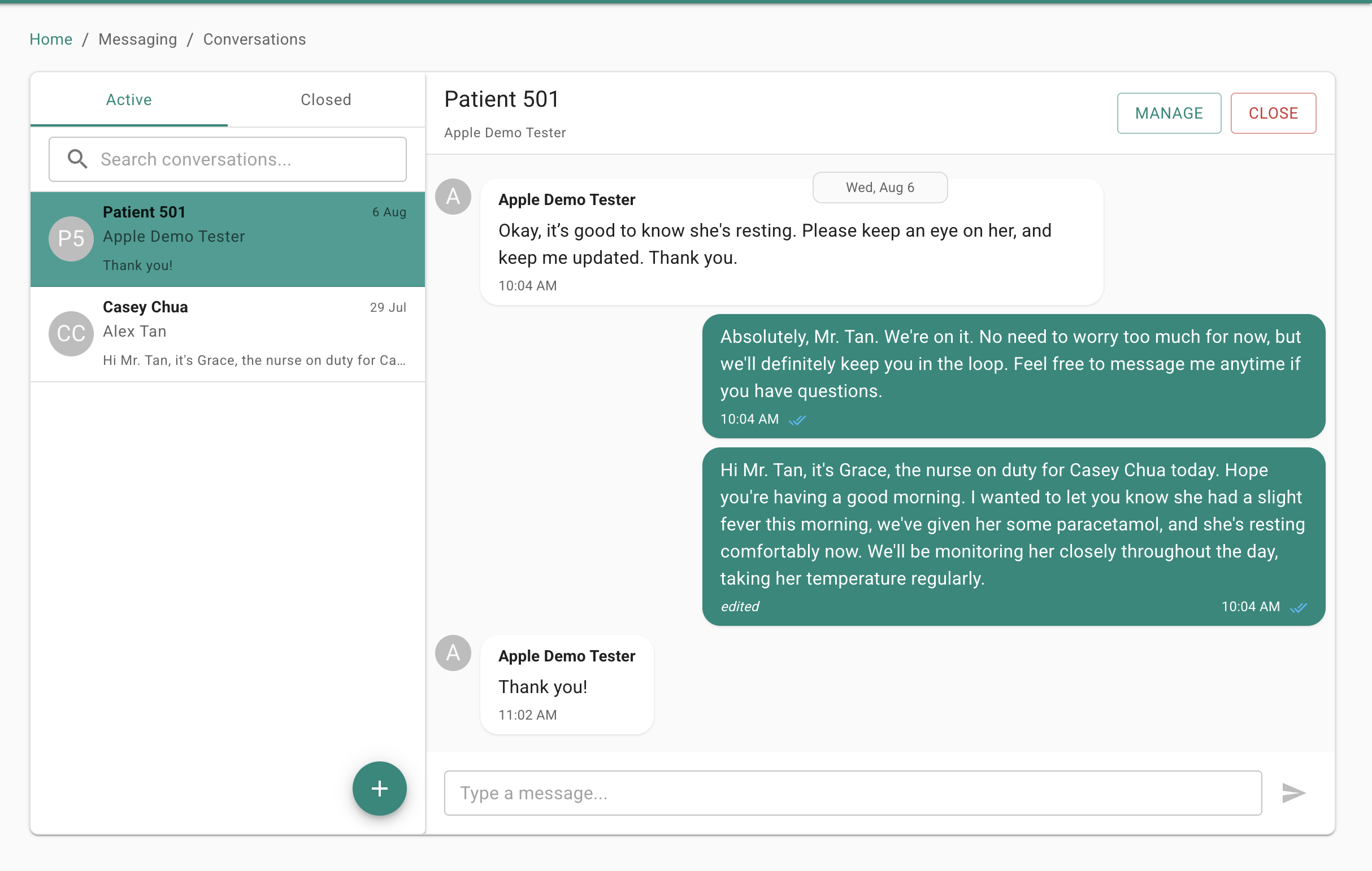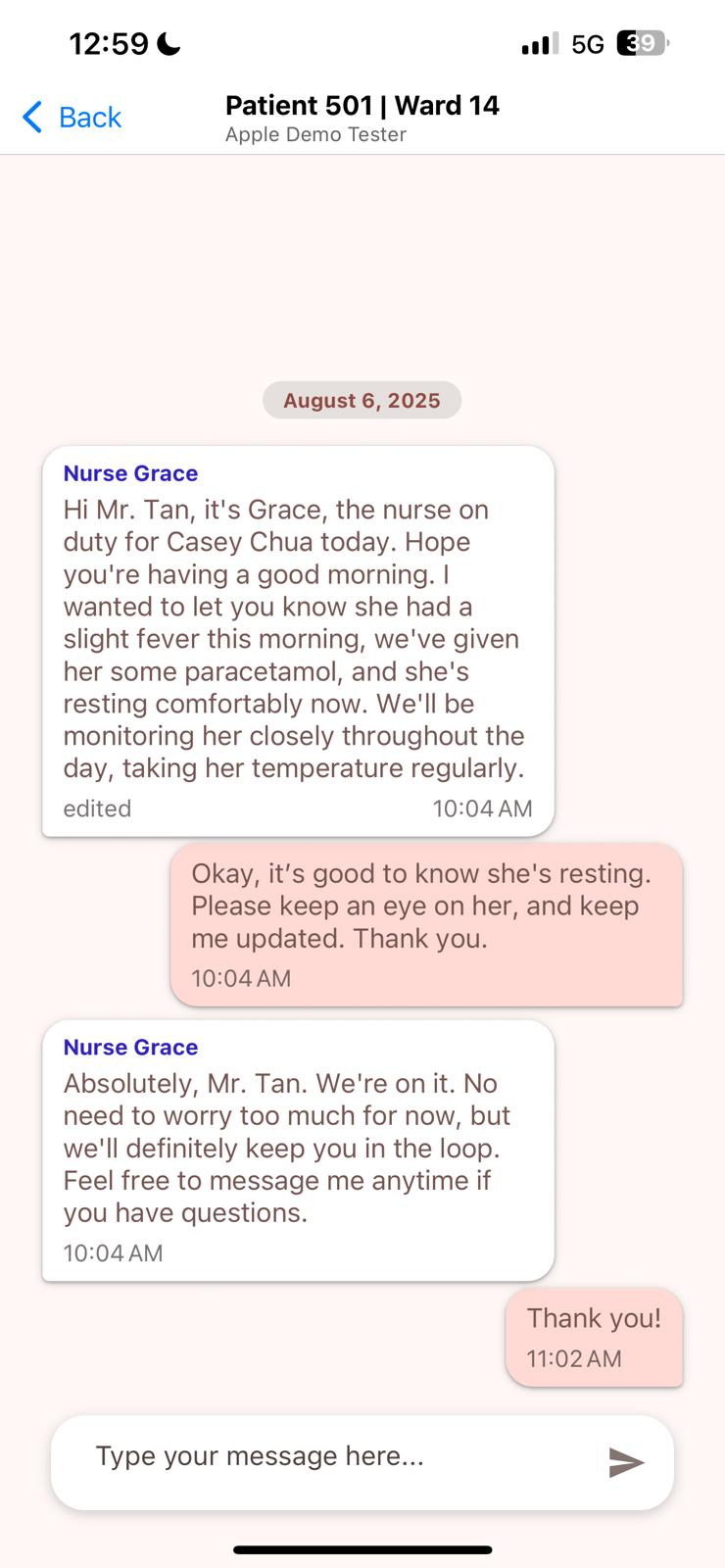 On top of the broadcasting module, we also designed a messaging module to facilitate ad-hoc, one-to-one communication between nurses and NOK. Its design is inspired by popular messaging platforms like Whatsapp and Telegram, to ensure familiarity and ease of use for both staff and NOK.
